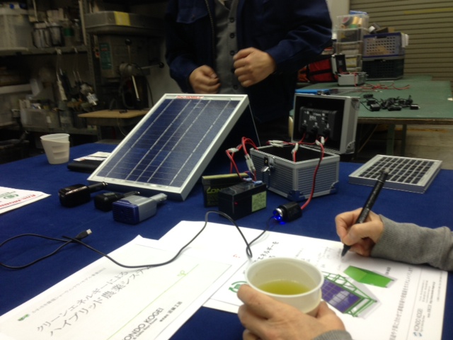 高津区に事業所をもつ近藤工芸にお邪魔してミニ太陽光パネルとバッテリーのお話を伺いました。